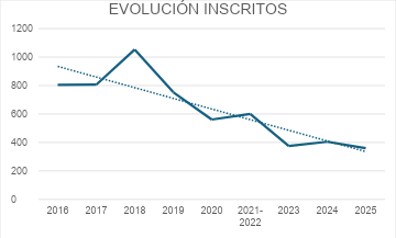 En primer lugar, cabe destacar que el número de inscritos parece mantener una tendencia bastante acusada de descenso. Se ha pasado de más de 1.000 personas en 2018 a apenas 359 en la convocatoria 2025. Mientras tanto, el número de plazas se mantiene en niveles razonables y los aprobados descienden en paralelo a la reducción de participantes.